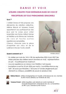 Chaque voix, chaque résonance intérieure peut devenir matière d’une création artistique. C’est aussi ça que le REV peut contribuer à faire: offrir un espace où on devient visible.